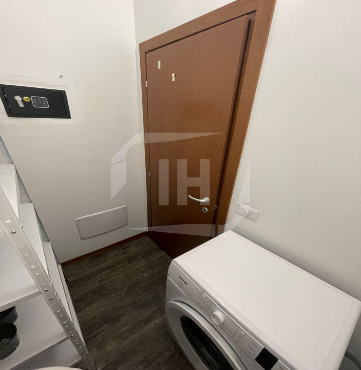> 1 debara in care se afla un raft pentru depozitare si masina de spalat rufe